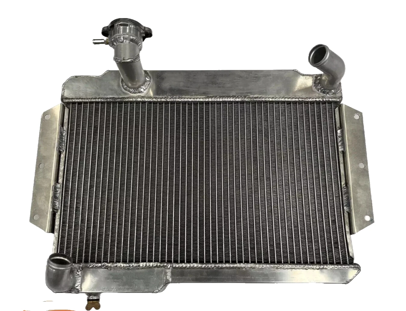 RADIATOR is heavy duty designed, comes with 2 row thick core.The core of the radiator is welded in vacuum brazing furnace, no epoxy. The tanks are 100% welded by TIG.The material of the radiators is the same as aircraft manufacture material.